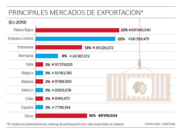 Los principales mercados internacionales a los que se exporta el cacao peruano en sus diversas presentaciones son Países Bajos, Estados Unidos, Indonesia, Alemania, Italia, Bélgica, Malasia, México, Chile, España, Reino Unido, entre otros.