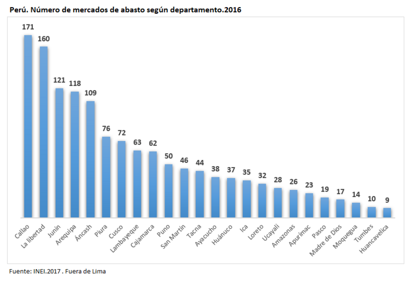 En el Perú existen 2612 mercados de abasto, de los cuales 44 son mayoristas y 2568 minoristas. 1232 se encuentran en Lima. Es un canal importante para la economía nacional porque provee empleos a más de 9000 personas. Además, el 75% de los peruanos realizan sus compras en este tipo de locales (INEI, 2017).
