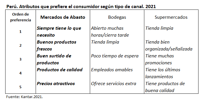 El consumidor valora de manera diferente los atributos de cada canal. A continuación, se muestra en orden de mayor a menor las características preferidas según el tipo de punto de venta.
