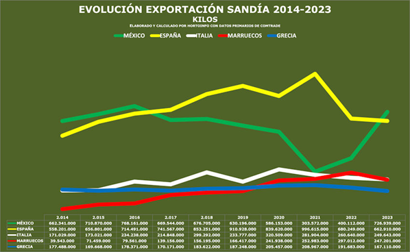 Hasta 2017 México exportaba un volumen de sandía mayor que el español, pero en ese mismo año las exportaciones españolas alcanzaron un mayor volumen que las mexicanas, hasta que en 2023 las exportaciones mexicanas han superado en volumen a las españolas, haciéndose así con el cetro como mayor exportador mundial de sandía por volumen.
