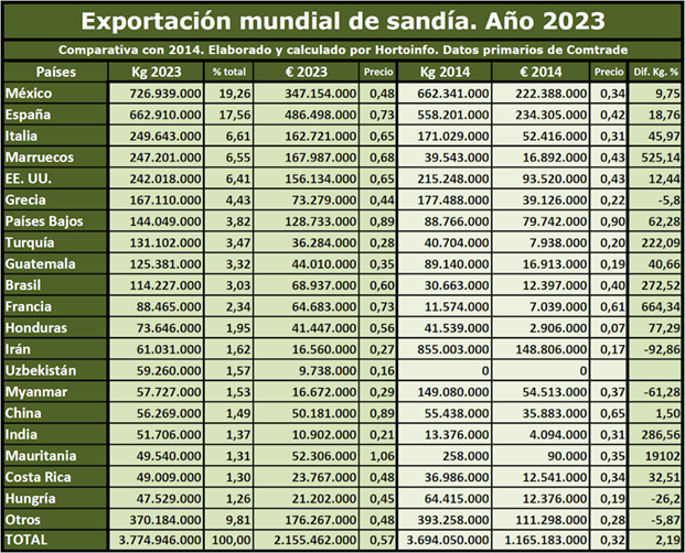 En el 2023 entre México, España, Italia y Marruecos exportaron la mitad de todas las sandías que se vendieron en el mundo, un 49.98% del total. México exportó el 19.26% del total con 726.94 millones de kilos, España el 17.56% con un volumen de 662.91 millones de kilos, Italia el 6.61% con un total de 249.64 millones de kilos y Marruecos el 6.55% del total mundial, con una cantidad de sandía exportada en 2023 de 247.2 millones de kilos.