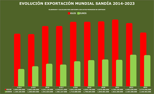 Como señalábamos, España mantiene la primera posición mundial por el valor de la sandía exportada, ya que en el pasado año 2023 vendió sus sandías al exterior por la cifra de € 486.5 millones, el 22.57% de los € 2.155.46 millones que supuso el total de la exportación mundial de sandía.