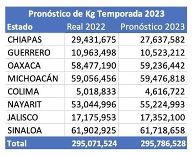 En la actual temporada, el estado que tendrá más producción será Sinaloa con 61.718.658 kilos, siguiéndoles después otros estados como Michoacán con 59.476,818, Oaxaca con 59.236.442, Nayarit con 55.224.993 y Chiapas con 27.637.582 kilos.