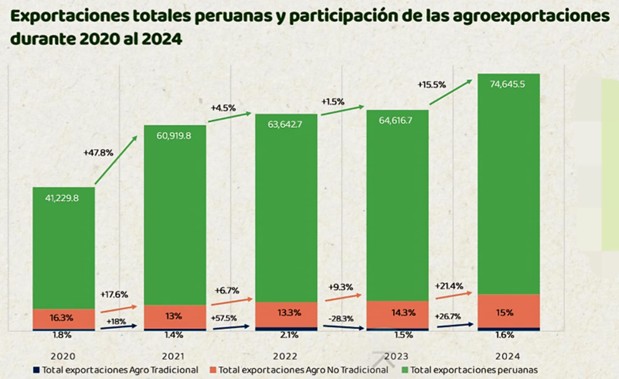 El gerente central de Exportaciones de ADEX, también señaló que, en el periodo 2020-2024, las exportaciones totales y las agroexportaciones presentan una tendencia creciente. Detalló que en 2020 las exportaciones totales por parte de Perú ascendieron a US$ 41.229.800.000, de los cuales las agroexportaciones participaron con el 14%; mientras que en el 2024 las exportaciones totales sumaron US$ 74.645.500.000, de los cuales las agroexportaciones representan el 18%. Añadió que el crecimiento promedio anual de las agroexportaciones en los últimos cinco años fue de 13.6%. “Estas cifras demuestran el posicionamiento estratégico de las agroexportaciones en nuestra canasta exportadora”.