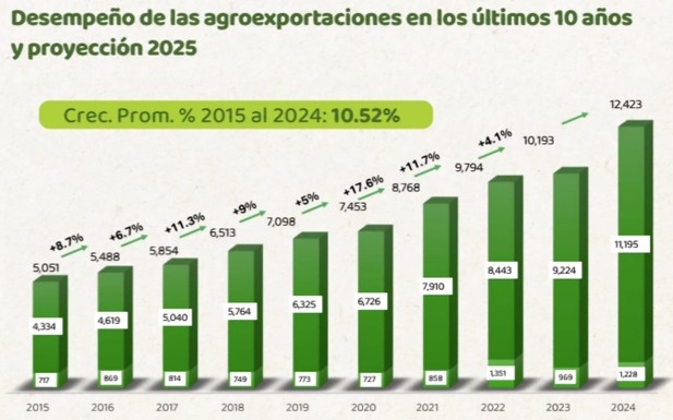 Asimismo, dijo que el desempeño de las agroexportaciones ha sido muy favorable en la última década. Detalló que entre el 2015 y 2024 el crecimiento promedio anual ha sido de 10.52%. Añadió que más del 90% de las agroexportaciones son exportaciones en el sector no tradicional, donde destaca el sector de frutas y hortalizas frescas.