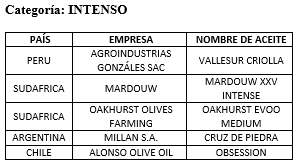 Asistieron 10 empresas peruanas: 7 de Tacna, 2 de Arequipa y 1 de Moquegua, que en conjunto presentaron 15 muestras. Dos de ellas, clasificaron entre los cuatro mejores aceites y la empresa agrícola Fundo Verde, obtuvo el segundo puesto en la categoría Frutado Intenso.