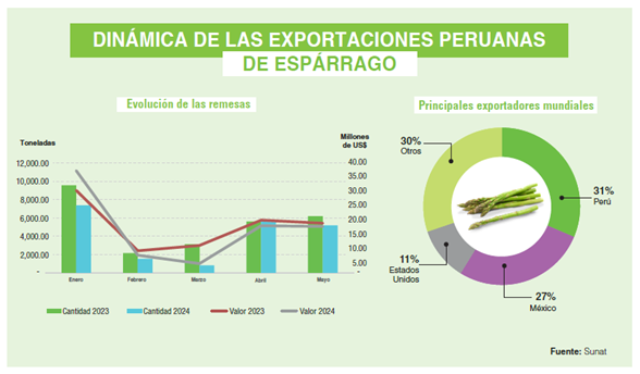 Las proyecciones iniciales indican que el año cerraría en un nivel similar, pero se presentaría una leve mejora conforme se acerque el final del año. Por tanto, en un escenario de regularización climática y un correcto desarrollo de la demanda, según las proyecciones de Fresh Fruit, las exportaciones de espárrago de todo el 2024 registrarían una caída del 18% en volumen y del 4% en valor.