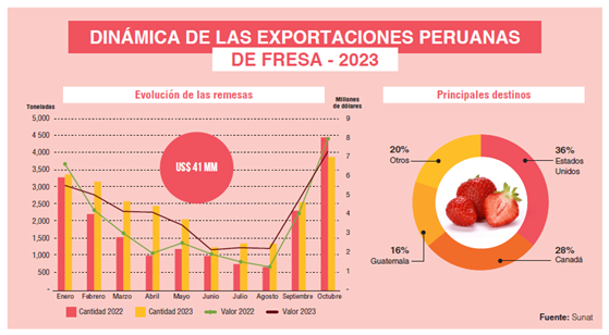 En ese mes, las fresas procedentes de Perú llegaron a 14 países, siendo los principales destinos Estados Unidos (con 38% de participación) y Canadá (32%).