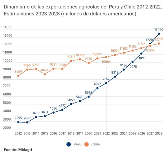 Según el Ministerio de Desarrollo Agrario y Riego (Midagri), al cierre de 2022, las exportaciones agrícolas peruanas alcanzaron la cifra récord de 7,557 millones de dólares y Chile logró exportar 10,664 millones de dólares.