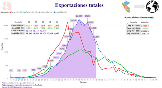 En la semana 48 se enviaron 12.819 toneladas a los mercados internacionales, lo que significa un 66% por sobre lo que fue la campaña 2023 / 2024 en esta misma semana y -12% de lo que fue la última proyección para la fecha.