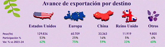 En total, a la semana 48, van 245.625 toneladas de arándanos enviados a los distintos mercados, lo que significa un 63% sobre lo que fue la campaña 2023 /2024 y un porcentaje exacto de acuerdo con las proyecciones de octubre pasado.