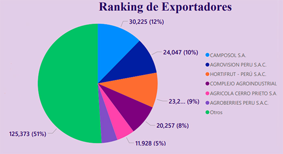 En los envíos, el volumen lo encabeza la empresa Camposol, con 30.225 toneladas, lo que significa un 12% del total, le sigue Agrovisión Perú SAC, con 24.047 toneladas, que corresponde a un 10% del total; Hortifrut Perú SAC, con 23.280 toneladas, (9%); Complejo Agroindustrial, con 20.257 toneladas (8%); Agrícola Cerro Prieto, con 11.928 toneladas (5%) y Agroberries Perú, con casi 10.000, que corresponde a un 4%. Las restantes 125 mil toneladas, que corresponde a un 51% de las exportaciones, tiene orígenes no registrados de diversos productores.