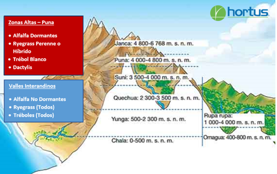 Según la zona climática podemos ubicar las principales zonas forrajeras y ganaderas de nuestra sierra en dos categorías. En primer lugar, tenemos los valles interandinos donde suelen presentarse temperaturas frías pero que no llegan a los cero grados centígrados, por lo tanto, no hay peligro de congelación y de mortandad de los forrajes. Además, en distintas zonas se suele contar con la posibilidad de aplicar riego, entonces en estas zonas se suelen utilizar los forrajes de mayor calidad y mayor productividad como las Alfalfas no dormantes, los Ryegrases y los tréboles. En estas zonas tenemos alturas de 2000 hasta los 3.300, 3.400 metros sobre el nivel del mar. En zonas más altas por ejemplo de 3.800 hasta los 4.200, podemos utilizar especies forrajeras que son más tolerantes a las heladas, más tolerantes a la sequía. Pero que no suelen tener la calidad forrajera que las mismas especies que se suelen centrar en climas más benignos.