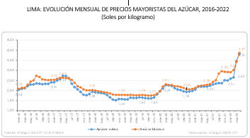 Pero, el conflicto entre Rusia y Ucrania entre otros factores, ha agudizado más el alza especulativa del precio internacional del azúcar, por los diversos costos que se han incrementado, uno de ellas el aumento de los insumos (fertilizantes). La comercialización mayorista se viene reflejando al mes de abril en el alza del precio de la azúcar blanca y rubia las cuales subieron hasta S/ 3,87 y 3,81 por kilogramo, aumentando en 71% y 73% por encima de los precios en el mismo mes del año 2021.