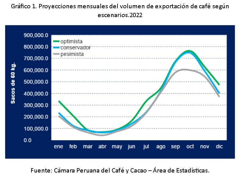 (Agraria.pe) La Cámara Peruana del Café y Cacao (CPCC) presenta sus pronósticos de volumen de exportación de café 2022, elaborados a partir de información histórica, sus resultados suelen ser certeros. El escenario conservador indica que el volumen de la exportación de café sería 3.8 millones de sacos de 60 kg, si bien sería 18% mayor que el 2021, consideremos que el año pasado las limitaciones logísticas afectaron la operación. En los dos primeros meses de 2022 los volúmenes de exportación han sido históricos, enviando los cafés que no pudieron salir el año pasado.