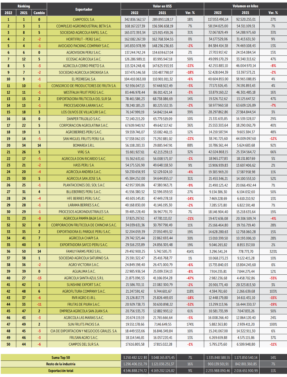 La gran tabla de la página siguiente tiene el detalle de los volúmenes y valores en dólares FOB de las 50 compañías peruanas que más envíos de fruta fresca realizaron en 2022, de acuerdo a los datos de Fresh Fruit Perú, la empresa de inteligencia de mercado para el sector de las frutas y que colaboró con Redagrícola para la realización de este reporte.