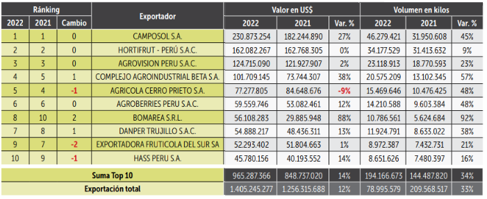 (Agraria.pe) Las grandes exportadoras peruanas de fruta son cada vez más grandes. Las 50 mayores compañías que exportaron fruta fresca durante 2022 incrementaron sus volúmenes de envíos en 14% el año pasado, llegando a casi 1.336 millones de kilos. El crecimiento de estos jugadores duplicó el del resto de los exportadores que solo incrementaron volúmenes en 7%, lo que se reflejo en un alza total de toda la industria de 11%, hasta los 2.236 millones de kilos.