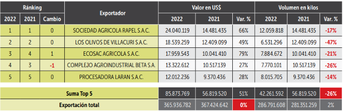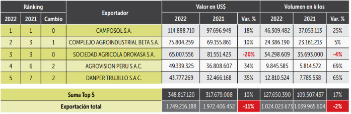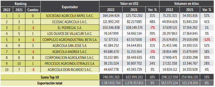 como los volúmenes de sus envíos de 2022. El buen avance que tuvo la firma en arándanos, fue contrarrestado por su caída en uva. No obstante, el alza fue suficiente para pasar del lugar N°3 del ranking general al Nº2°, tomando el lugar de Hortifrut, que no registró crecimiento en los valores exportados.
