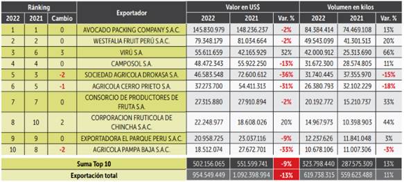 Avocado Packing Company es la única empresa enfocada en paltas que logra colarse en el top 5 de las mayores exportadoras peruanas que, pese a descender 2% en los valores registrados, logró un alza de 13% en sus volúmenes.