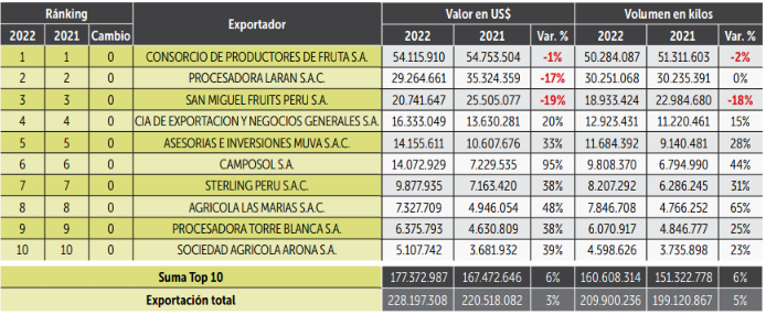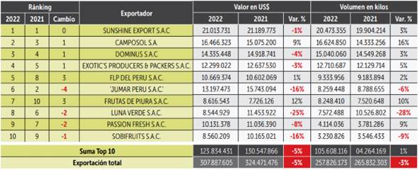 Mayores exportadores de fruta fresca de Perú (Ordenados por valores en dólares exportados)
