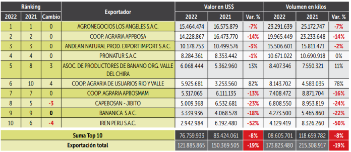 No todas las historias fueron de felicidad. De las 50 mayores empresas, hubo 22% que vieron disminuir los valores de sus envíos. En esto, fueron duras las caídas de Agrícola Santa Azul, que bajó en 47% sus valores y en 33% sus volúmenes. Frutas de Piura, por su parte, disminuyó en 32% sus valores y en 19% sus volúmenes.