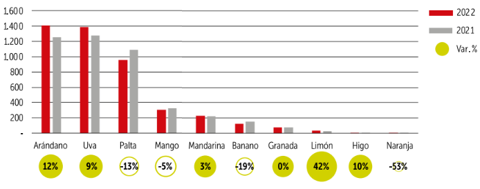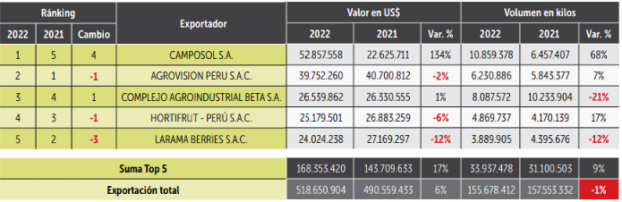 El crecimiento de 2022 fue muy distinto de acuerdo al tipo de fruta exportada. De hecho, el arándano pasó a ser la fruta con mayor valor exportado, al subir 12% y llegar a los US$ 1.405 millones. Este incremento se dio gracias a una expansión de 33% en los volúmenes, contrarrestando así la caída de precios. Camposol, Hortifrut y Agrovision mantuvieron los tres primeros lugares en volúmenes exportados de esta fruta.