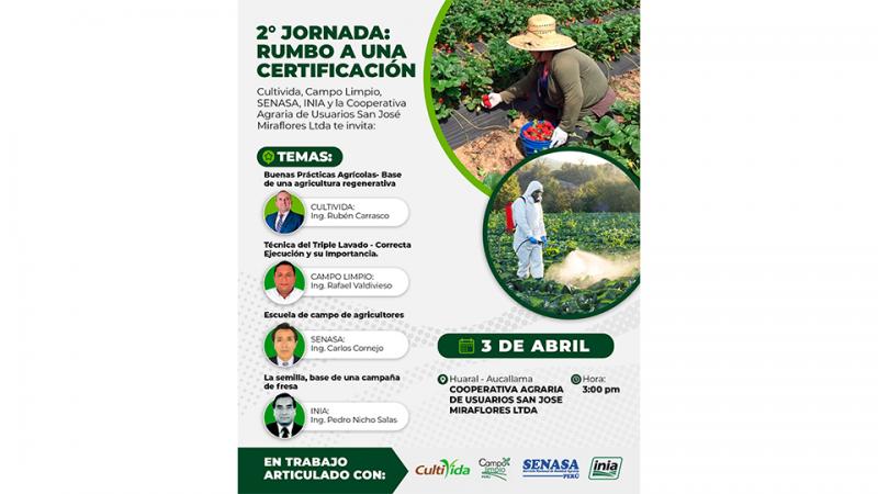 (Agraria.pe) Con el objetivo de promover una agricultura más eficiente, segura y sostenible, CultiVida, Campo Limpio Perú, el Servicio Nacional de Sanidad Agraria (Senasa), el Instituto Nacional de Innovación Agraria (INIA) y la Cooperativa Agraria de Usuarios San José Miraflores Ltda. organizan la Segunda Jornada "Rumbo a una Certificación", que se llevará a cabo el próximo 3 de abril a las 3:00 p.m. en la sede de la cooperativa en Huaral.