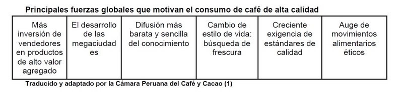 Las iniciativas globales para la promoción del consumo de café han contribuido sustancialmente a aumentar la conciencia de los consumidores sobre el vínculo entre la calidad y el tipo de café. Esto ha generado que los pequeños vendedores tomen iniciativas para participar en su mercado local en función a un formato de alta calidad como el café fresco, aquel que buscan los consumidores concientizados. De esta manera se crean oportunidades en su mercado nacional.