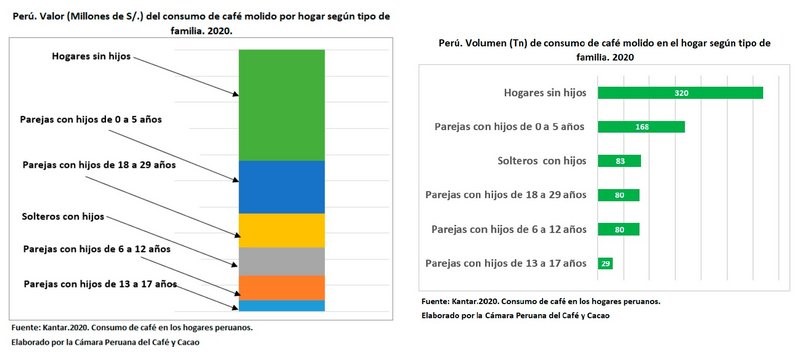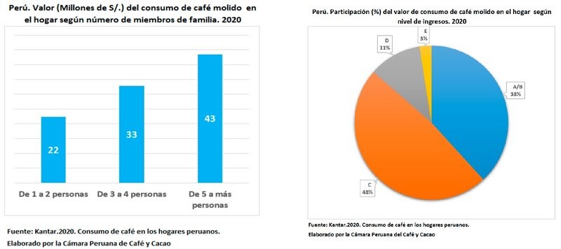 En el Perú el café molido es una bebida que se prepara mayormente para compartir en familia: la cafetera gota a gota se ha posicionado en la memoria. El valor del consumo de este producto es mayor en los hogares integrados por 5 o más personas, principalmente en familias de clase media, es decir, de nivel socioeconómico C (Kantar, 2020).