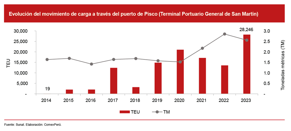 La Sociedad de Comercio Exterior del Perú (Comex Perú), señaló que aunque el puerto del Callao encabeza el ranking del SPN al registrar las cifras más altas en TEU, el Terminal Portuario General San Martín (TPGSM), ubicado en la provincia de Pisco, destaca como el puerto del litoral peruano con el mayor incremento en el movimiento de carga contenerizada en 2023, al presentar un crecimiento del 108.1% en comparación con el año anterior.