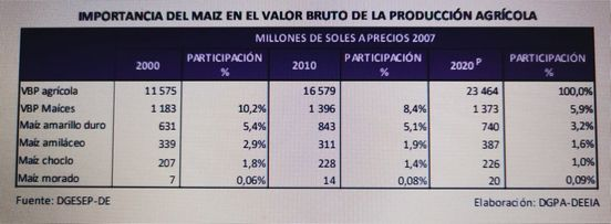 En el año 2000 el VBP Agrícola fue de S/ 11.575 millones, a precios constantes del 2007, mientras que el VBP del maíz en grano fue de S/ 1.183 millones, representando el 10.2% del VBP Agrícola, utilizando 543 mil hectáreas de tierras cosechadas.