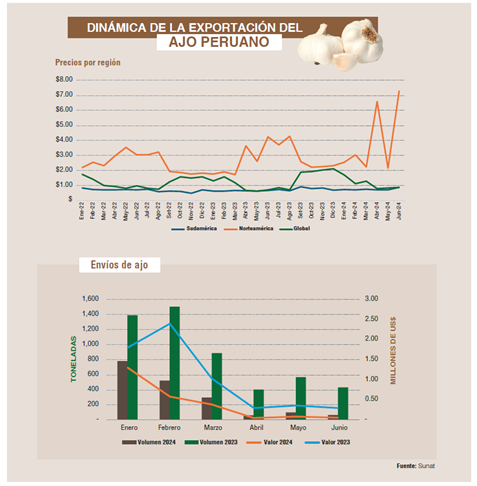 Durante el primer semestre, los envíos hacia Norteamérica han sido bastante reducidos. A pesar de que la caída de las exportaciones de ajo chino abrió nuevos espacios el año pasado, el Perú no ha podido colocar más volúmenes en este 2024. La disponibilidad es mucho menor al año anterior, también debido a la concentración de la anterior campaña en los primeros meses de cosecha (entre septiembre y noviembre). México fue el principal destino de la región, pero sufrió una caída de casi el 75%; mientras que el precio no pudo compensar el bajón, cerrando con una caída del valor de casi 62%. Los Estados Unidos se volvieron casi un destino secundario en estas fechas con una caída cercana al 88% en volumen y 84% en valor.