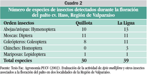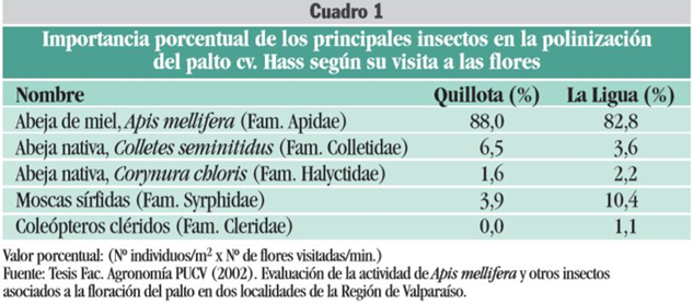 Los estudios en Chile y el extranjero han demostrado que, dadas las características de las flores y la compleja floración del palto, es imprescindible la participación de insectos que transporten el polen entre las flores. La abeja de miel es el insecto más importante que cumple este rol en las principales zonas productoras de Chile (cuadro 1).