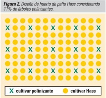 El mejor efecto se obtiene cuando están próximos a los árboles Hass, ya que las abejas tienden a visitar en un mismo vuelo un área que no sobrepasa de 3 árboles. Existe una combinación que implica incluir un 11% de plantas polinizantes para obtener un diseño que siempre deja un árbol polinizante rodeado de Hass.