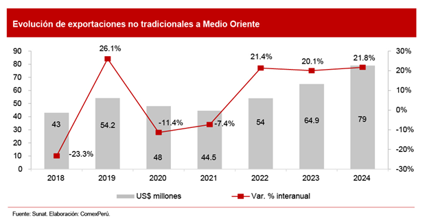 Por su parte, los despachos del sector no tradicional a Medio Oriente en 2024 alcanzaron los US$ 79 millones, reflejando un incremento de +21.8% respecto al 2023 (US$ 64.9 millones). Este sector concentró solo el 4% de las exportaciones totales a dicha región, sin embargo, continúa generando interés por su crecimiento en los últimos años.