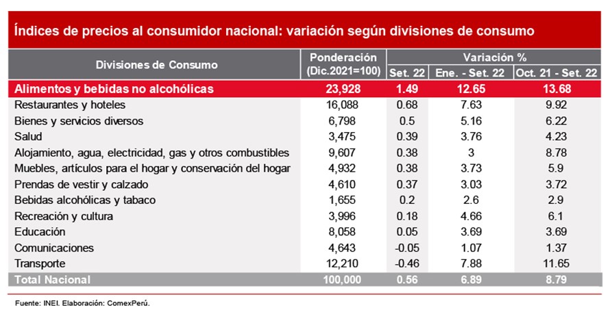 Estos resultados han sido influenciados, principalmente, por la variación en el consumo de alimentos y bebidas no alcohólicas, más aún por su ponderación en la canasta de consumo (23.92%). Así, este ha aumentado un 1.49% en el mes de setiembre, con una variación interanual acumulada de los últimos doce meses del 13.68%.