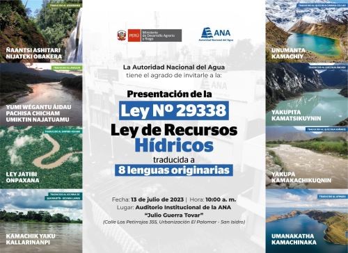 (Agraria.pe) La Autoridad Nacional del Agua (ANA) presentará a la Ley de Recursos Hídricos traducida en ocho lenguas originarias: Quechua Chanka Collao, Quechua Áncash, Quechua Kañaris, Asháninka, Aymara, Shipibo Konibo, Awajún y Kichwa de San Martín (Kichwa Lamas).