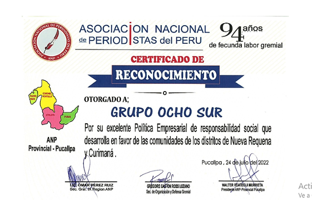 (Agraria.pe) En el marco de la celebración de su 94° aniversario de fundación, la Asociación Nacional de Periodistas (ANP) distinguió con un Certificado de Reconocimiento al Grupo Ocho Sur, por su política de responsabilidad social que practica en favor de diversas comunidades de los distritos de Nueva Requena y Curimaná, en Ucayali.