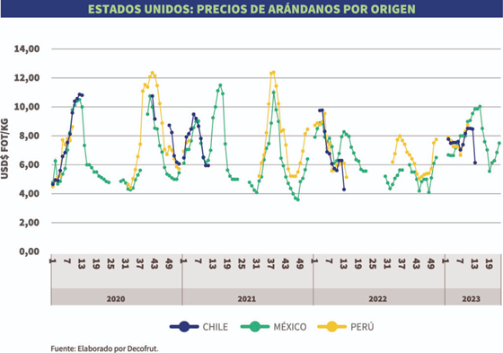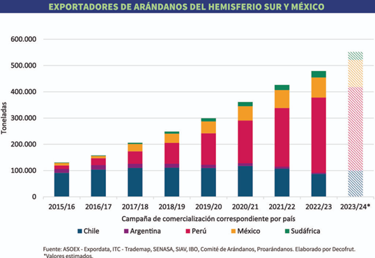 En cuanto al hemisferio sur, si bien existen otros competidores importantes como Chile, Sudáfrica y en menor medida Argentina, los arándanos peruanos se han impuesto y dominado los mercados, con capacidad para marcar la pauta y las tendencias para los demás países. Cabe mencionar que, por su parte, México también ha registrado un alza constante e importante en la producción de arándanos, sin embargo, casi la totalidad de su oferta se destina hacia Estados Unidos.