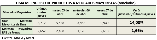 Mientras, en el Mercado Mayorista de Frutas No.2 (MMF) de La Victoria se tuvo un ingreso de 2.613 toneladas de frutas, cantidad levemente inferior en 2% respecto al promedio de los 4 últimos jueves. Se pudo registrar una ligera disminución en el ingreso de vehículos.