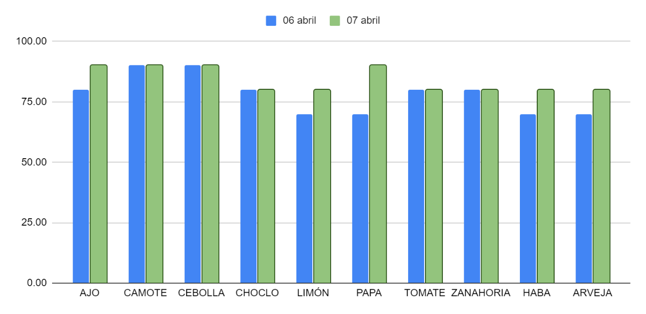 Ayer en el Gran Mercado Mayorista de Lima se registraron ofertas importantes de diversos productos en comparación al día anterior como: zapallo macre (de S/ 2.23 a S/ 1.80 ), cebolla cabeza roja (de S/ 1.78 a S/ 1.45), choclo tipo cusco (de S/ 2.80 a S/ 2.50 ), papa huayro (de S/ 1.65 a S/ 1.40) por kilogramo, principalmente. En cambio, por mayor demanda subieron de precio respecto al miércoles: arveja americana (de S/ 4.83 a S/ 5.38) y frijol verde canario (de S/ 4.00 a S/ 4.50) por kilogramo.