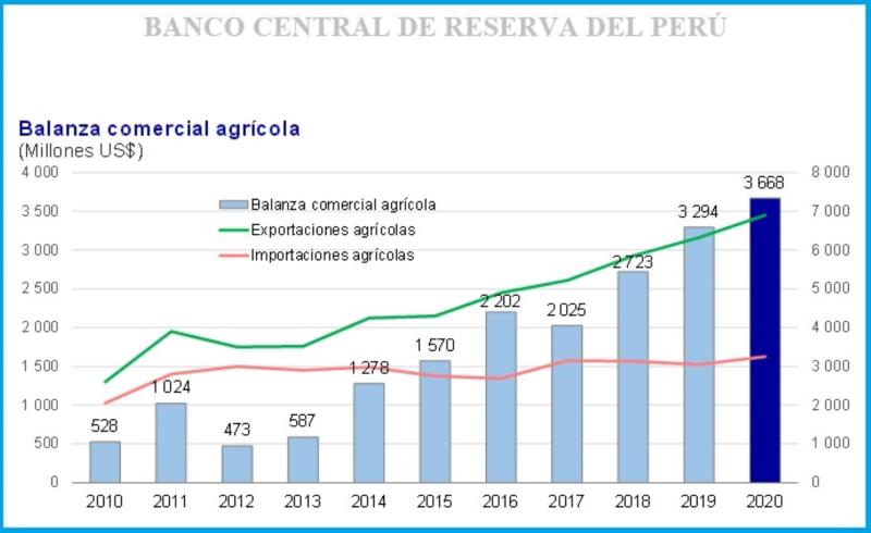 (Agraria.pe) El saldo de la balanza comercial agrícola del Perú en el 2020 fue superavitario y ascendió a US$ 3.668 millones de dólares, casi siete veces el valor de 2010, destacó hoy el Banco Central de Reserva (BCR).