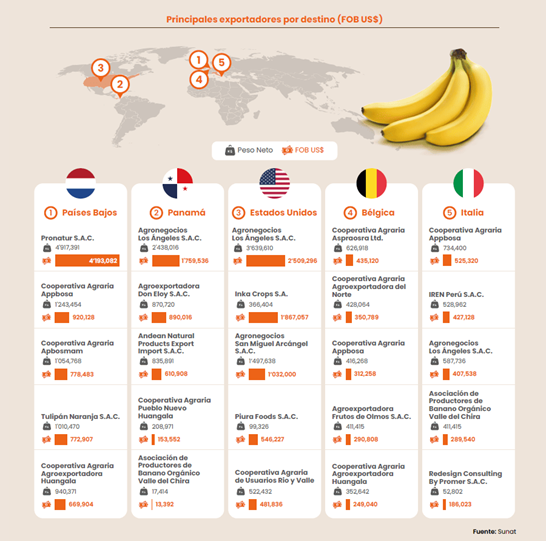 Europa se mantiene como el principal destino del banano peruano, con casi 23.392 toneladas enviadas durante el último trimestre, por un valor aproximado de US$ 19 millones. Sin embargo, esto representó una disminución del 16% en volumen y del 15% en valor. En este mercado, los principales competidores son Ecuador — líder mundial en exportación de banano—, junto con otros países latinoamericanos como Costa Rica y Panamá. Para la oferta peruana, la fuerte campaña de exportación reportada por Ecuador hace prever que los precios se mantendrán en los rangos actuales durante el resto del año.