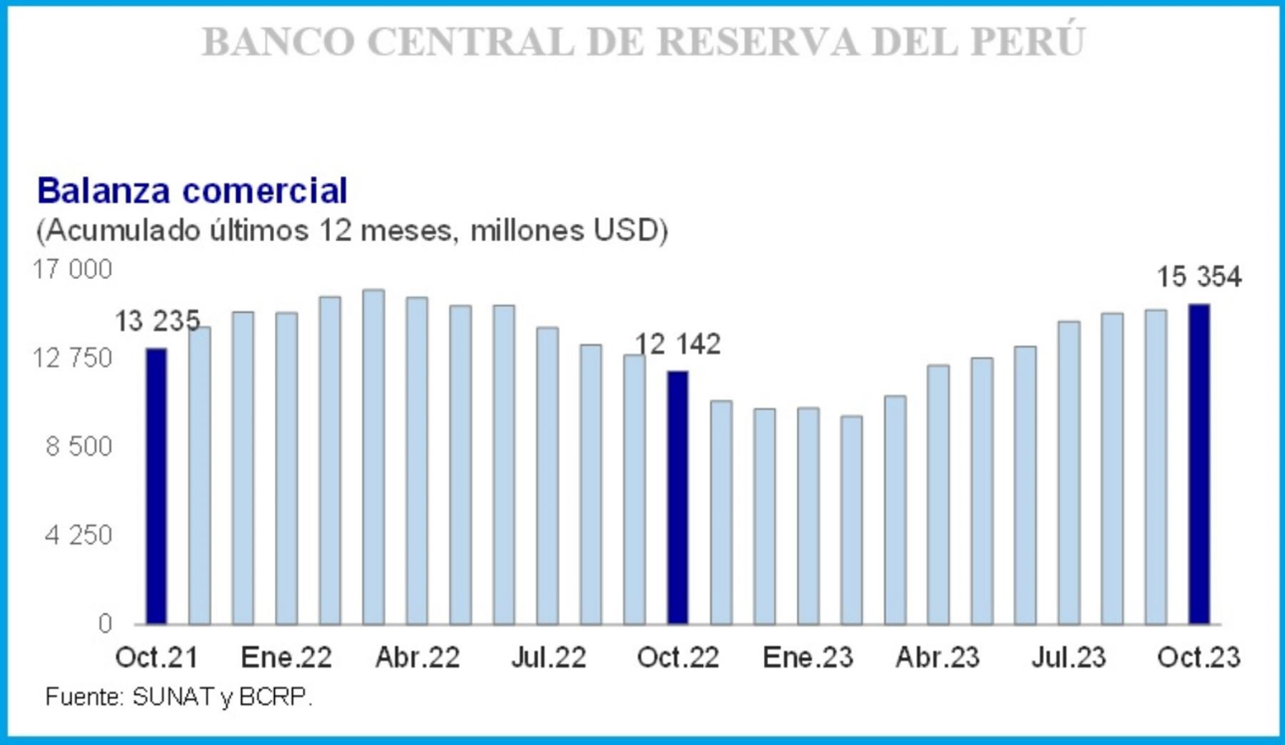 (Agraria.pe) La balanza comercial acumulada en los últimos 12 meses alcanzó un superávit de US$ 15.354 millones de enero a octubre del presente año, cantidad superior al del mes previo (US$ 15.083 millones), y la cifra más alta en año y medio, destacó el Banco Central de Reserva del Perú.