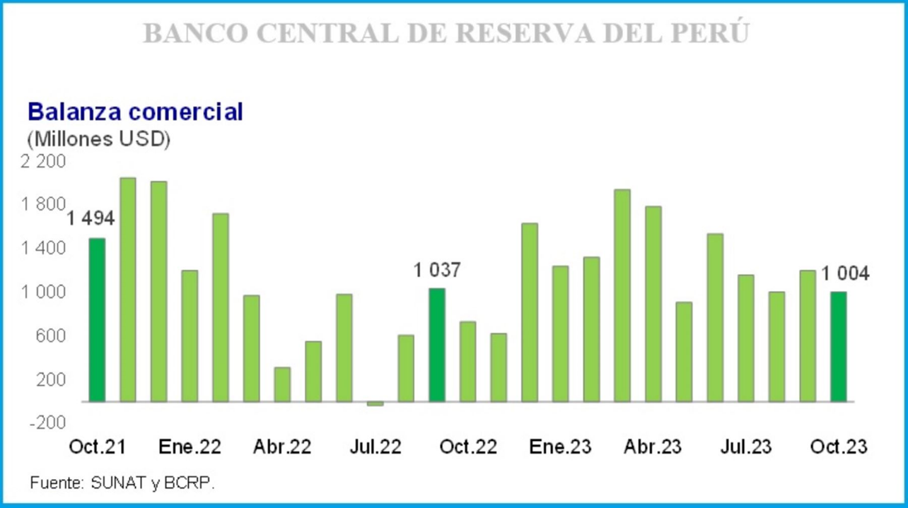 El ente emisor, detalló que, en términos mensuales, la balanza comercial registró un superávit de 1,004 millones de dólares en octubre y de 13,099 millones de dólares en los 10 primeros meses del año.
