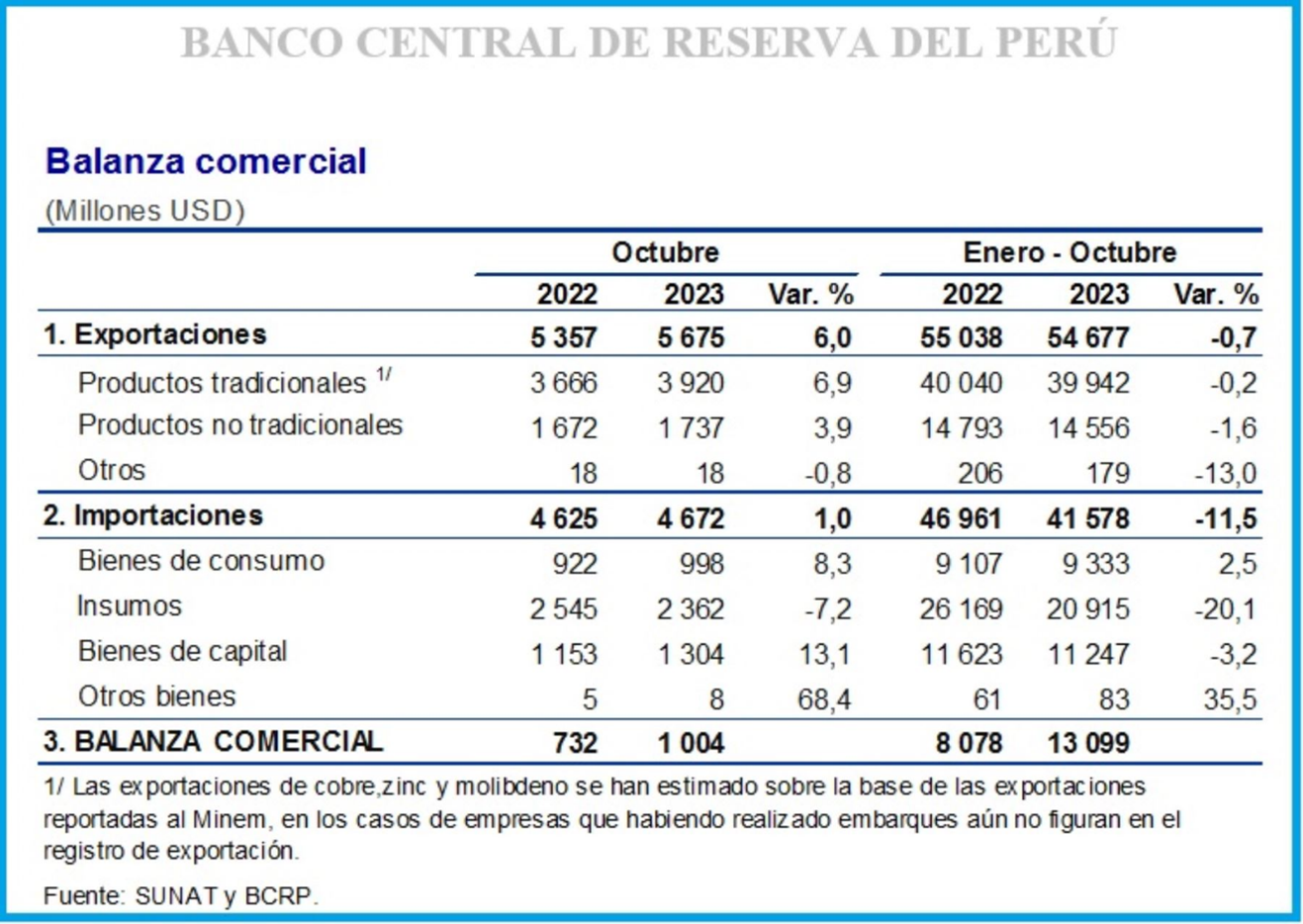 Las ventas totales al exterior en los primeros diez meses del año sumaron US$ 54.677 millones, una disminución de -0.7 % respecto a las del mismo periodo de 2022, detalló el Banco Central de Reserva del Perú.