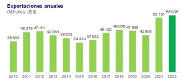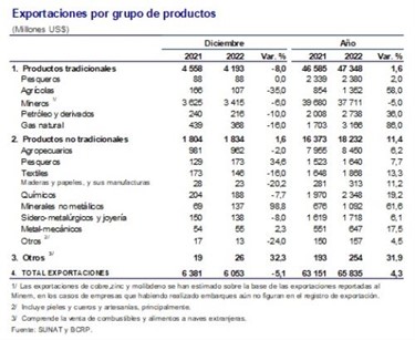 (Agraria.pe) En el 2022, las exportaciones peruanas ascendieron a US$ 65.835 millones, mostrando un aumento en US$ 2.684 millones (es decir 4.3% más) respecto a lo alcanzado en el 2021 (US$ 63.151 millones), informó el Banco Central de Reserva (BCR).