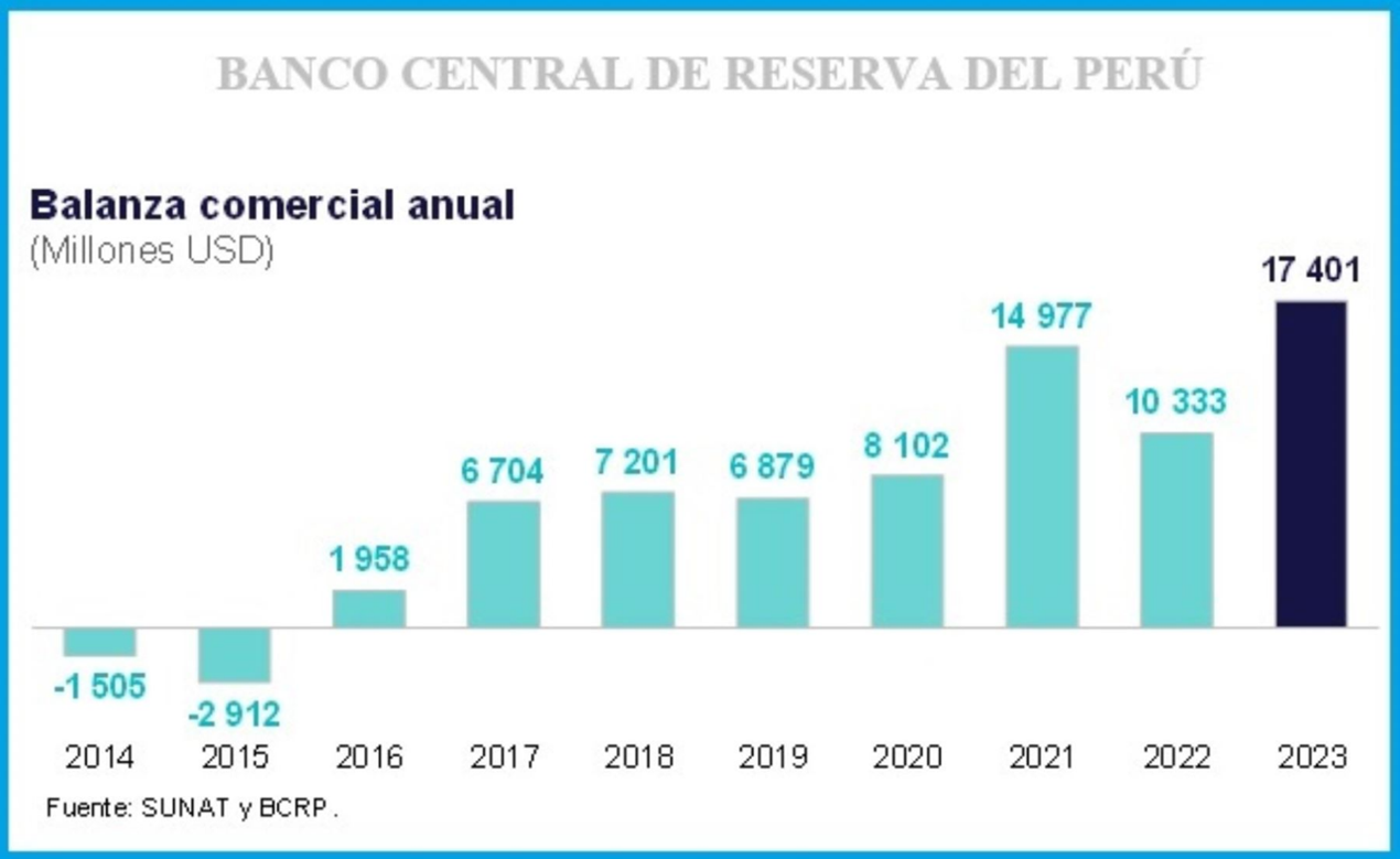 (Agraria.pe) La balanza comercial peruana alcanzó un superávit de US$ 17.401 millones en 2023, acumulando ocho años seguidos de resultados positivos y superando el valor máximo de US$ 14.977 millones registrado en 2021, indicó el Banco Central de Reserva (BCR).