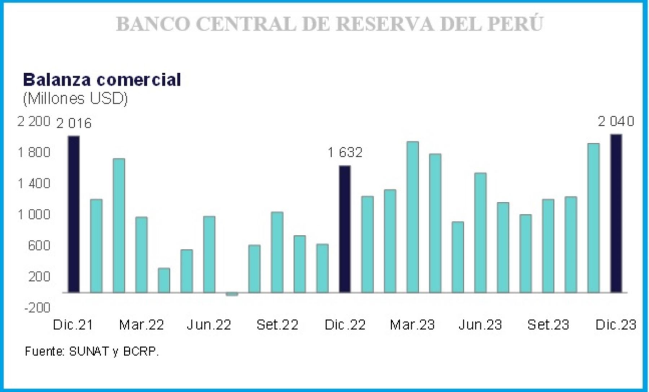 “En términos mensuales, en diciembre de 2023 se registró un superávit comercial de US$ 2.040 millones, superior en US$ 408 millones al conseguido en el mismo mes de 2022”, puntualizó el ente emisor.