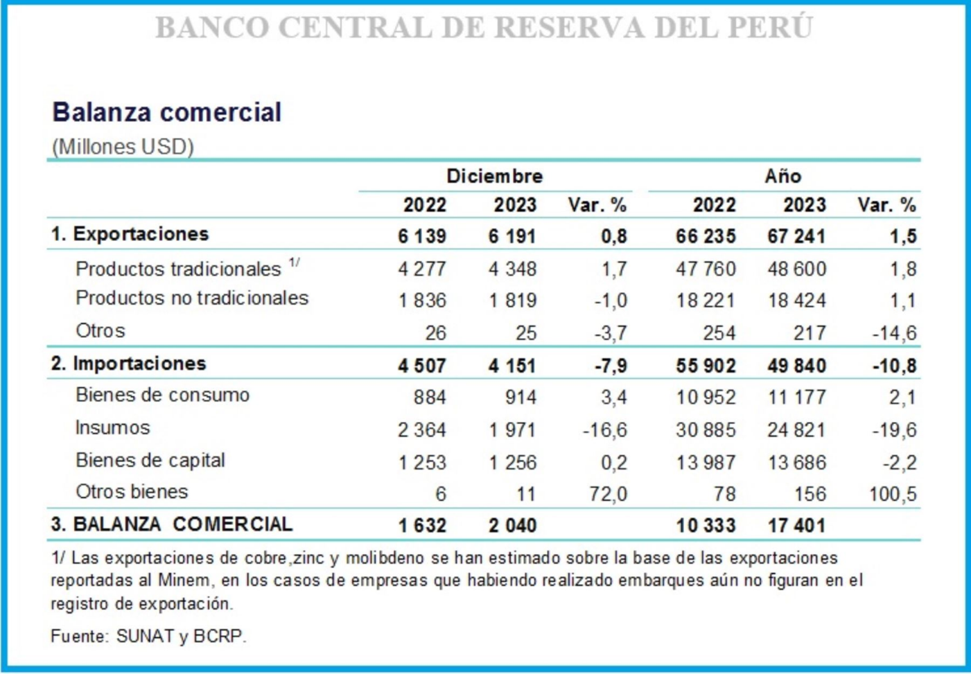 Asimismo, el Banco Central de Reserva, detalló que por componentes, tanto las ventas al exterior de productos tradicionales como no tradicionales registraron valores mayores a los de 2022. Asimismo, Las importaciones alcanzaron los US$ 49.840 millones en 2023, menores en -10.8 % con respecto a 2022.